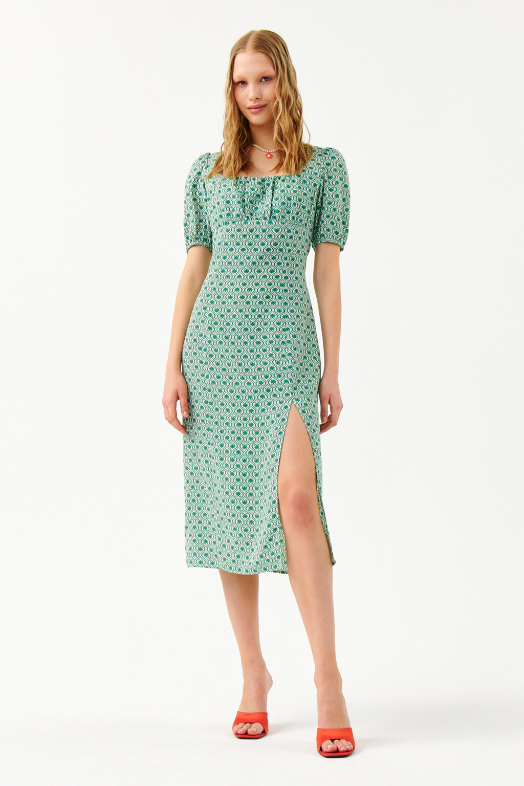 Платье-миди с квадратным вырезом и юбкой годе 00003822 зеленый купить в